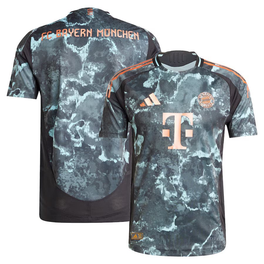 The Bayern Munich 2024/25 away jersey is a bold tribute to Bavarian heritage, drawing inspiration from Munich's iconic Bavaria statue. The kit features a black base adorned with turquoise and blue swirling accents, mimicking the statue's oxidized bronze surface. The club crest, adidas logo, and sponsor logos are rendered in metallic bronze, reflecting the statue's original color. Additionally, the club's motto "Mia San Mia" is printed in bronze on the back collar .β